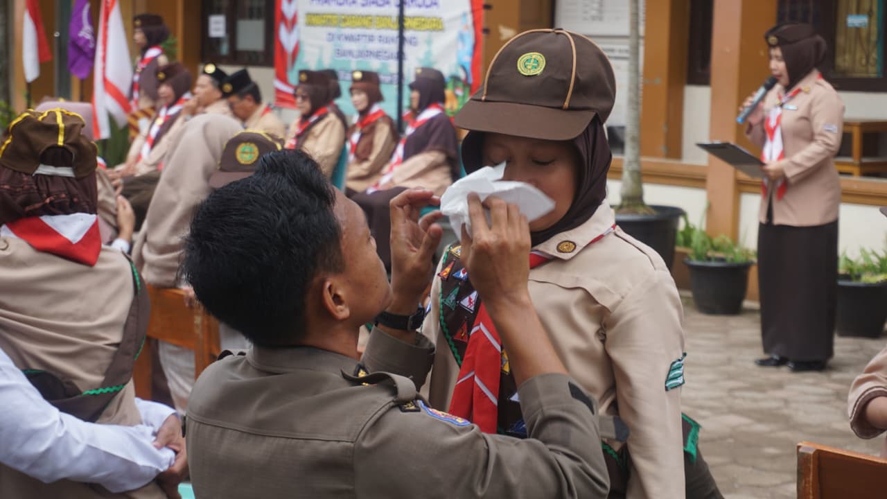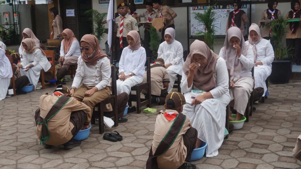 Sebelum Medali dan Tanda Pramuka Garuda tersemat di dada, sebuah pemandangan mengharukan memecah kesunyian. 53 anak berseragam cokelat lengkap dengan setangan leher, bersimpuh dengan tulus di hadapan orang tua mereka. Ini adalah prosesi adat yang menjadi ruh dari pelantikan kali ini: Mencuci Kaki Orang Tua.